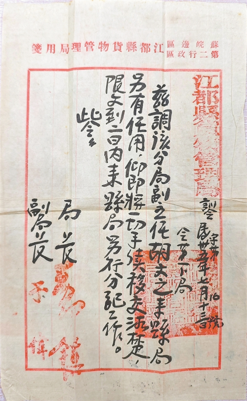 调令正文写道:“兹调该分局副主任胡文之来县局另有任用,仰即将一切手续移交清楚,限文到二日内来县局另行分配工作……”该调令内容清晰、格式规范,保存较为完整。调令上明确写有发文单位、事由、人员调动安排及具体时间等信息,并加盖“江都县货物管理局”的印章。虽然历经岁月,字迹依然清晰可辨。