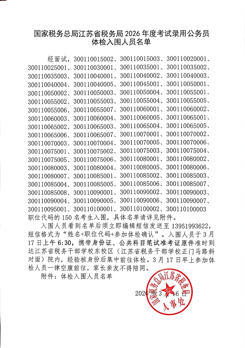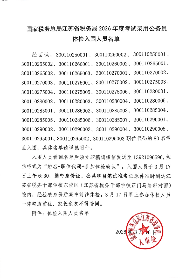国家税务总局江苏省税务局2026年度考试录用公务员3月16日体检入围人员名单公布如下,请体检入围人员认真阅读注意事项。