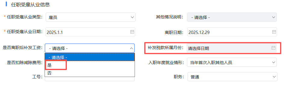 例如:员工离职后,企业于2026年2月所属期补发2025年终奖,需在【人员信息采集】的“是否离职后补发工资”选“是”,“补发税款所属月份”为2026年2月,纳税人即可在2月属期中补发该离职人员的收入。