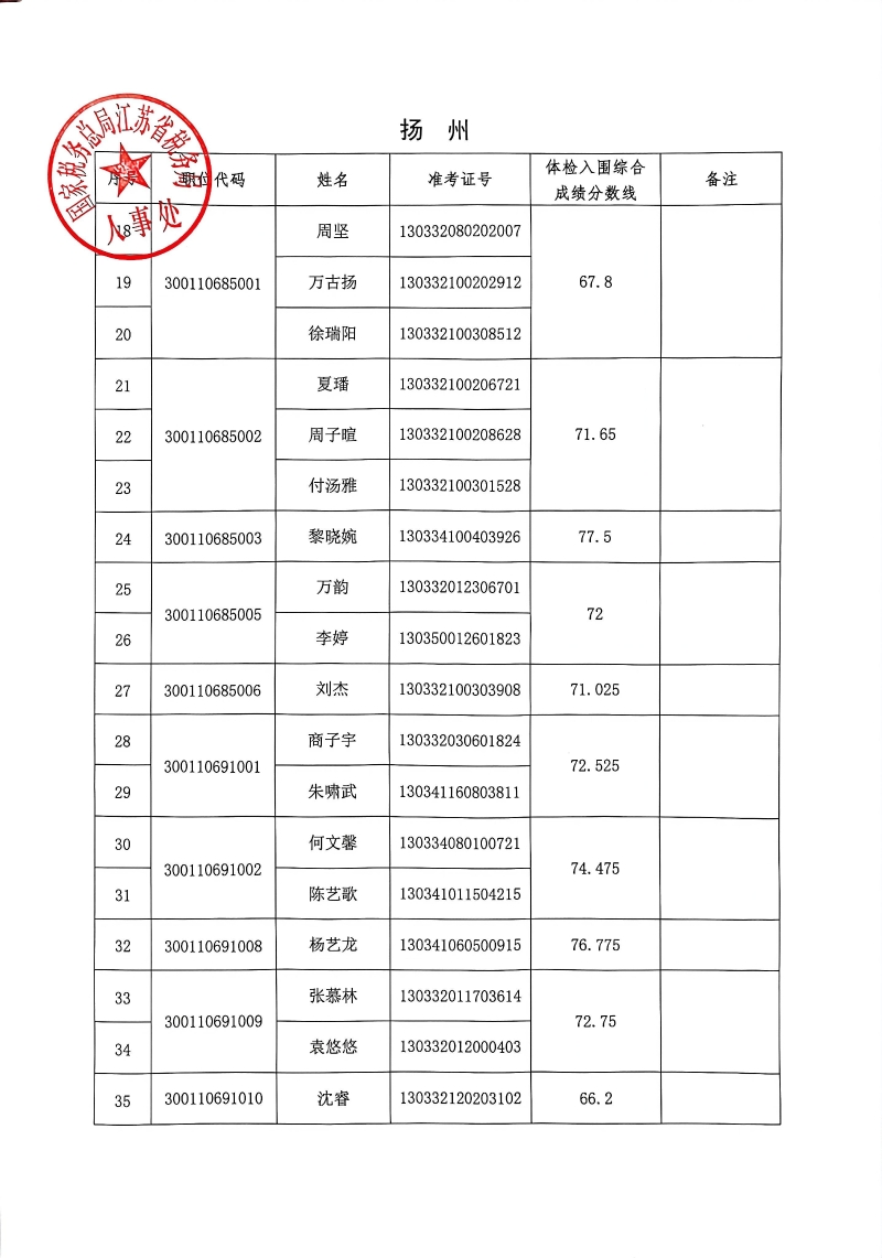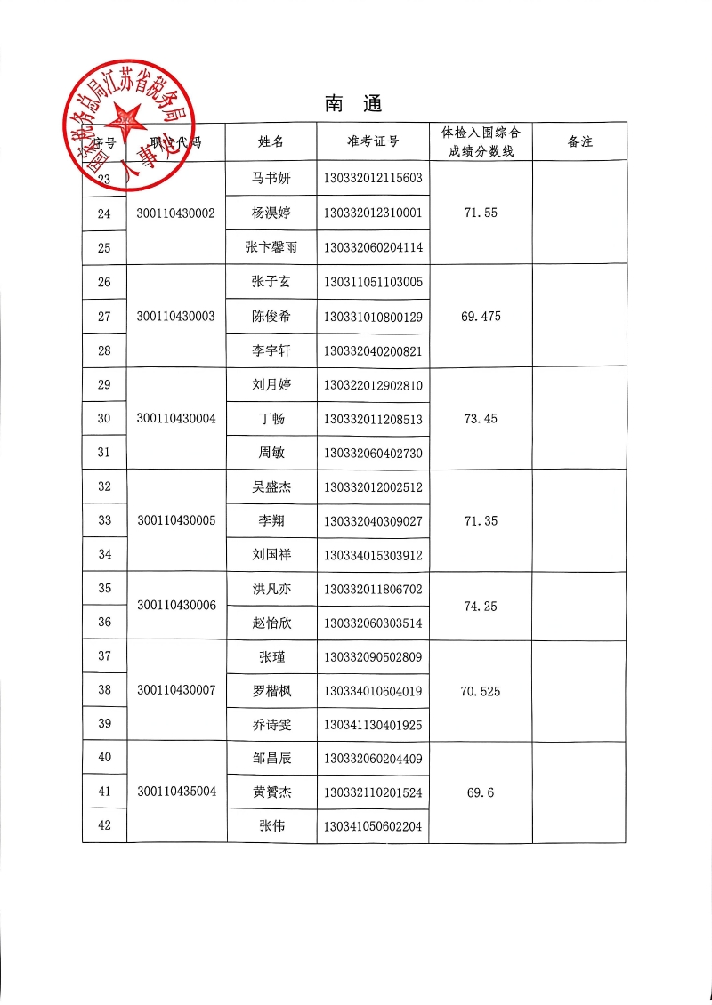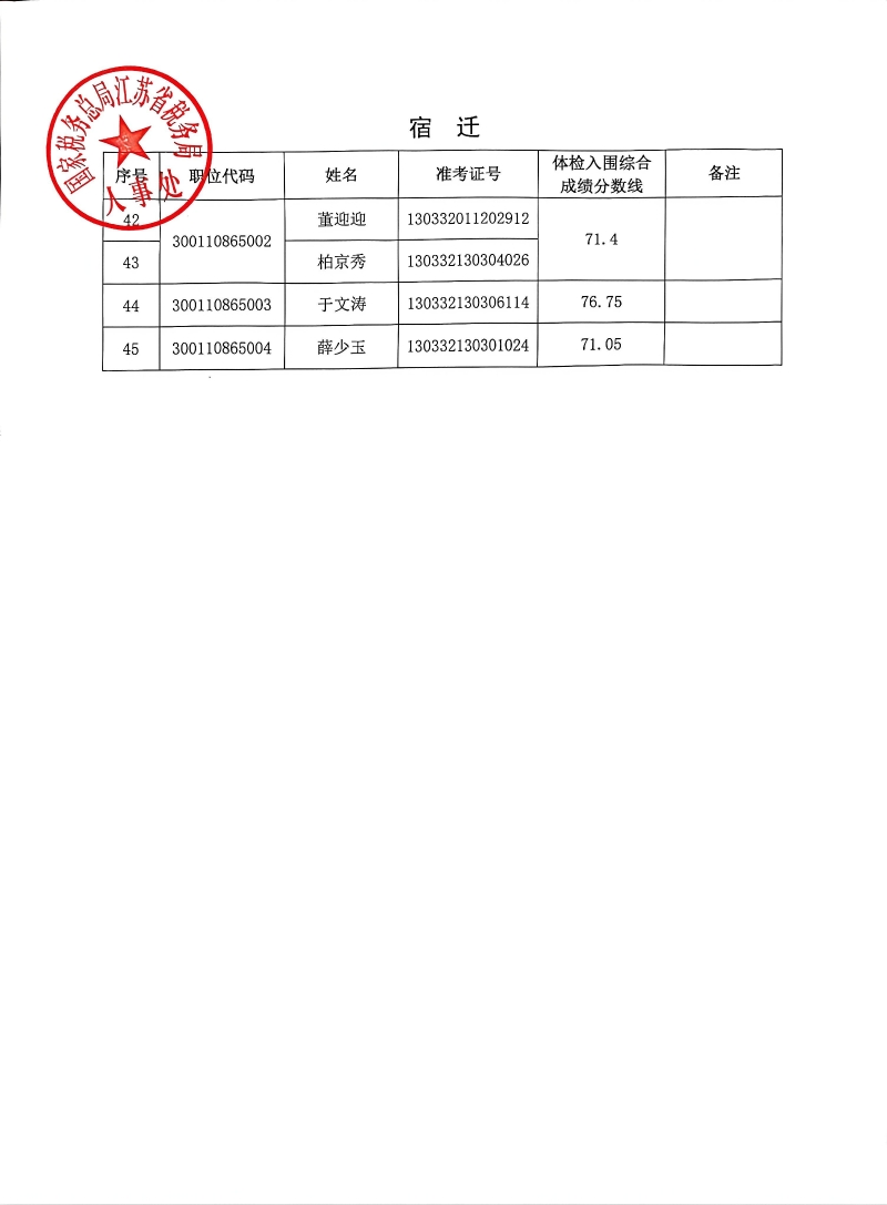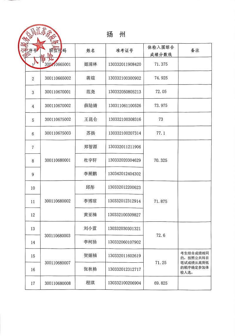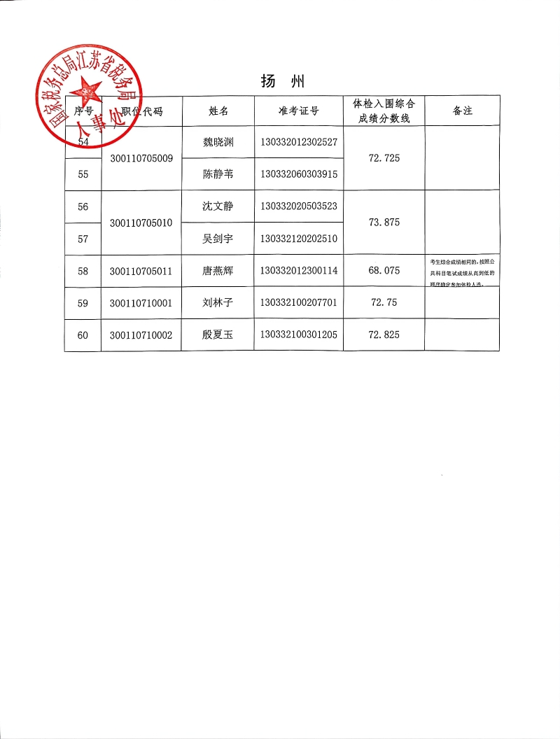 国家税务总局江苏省税务局2026年度考试录用公务员3月18日体检入围人员名单