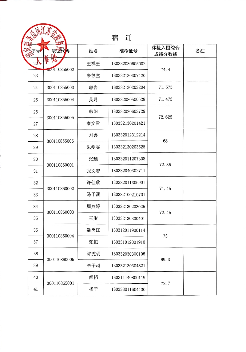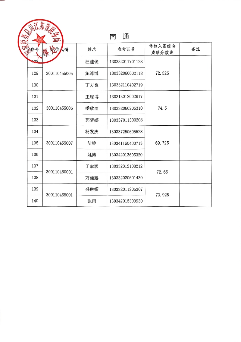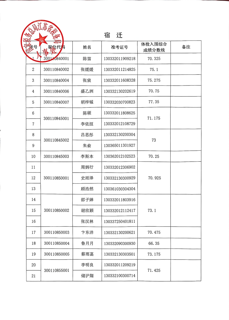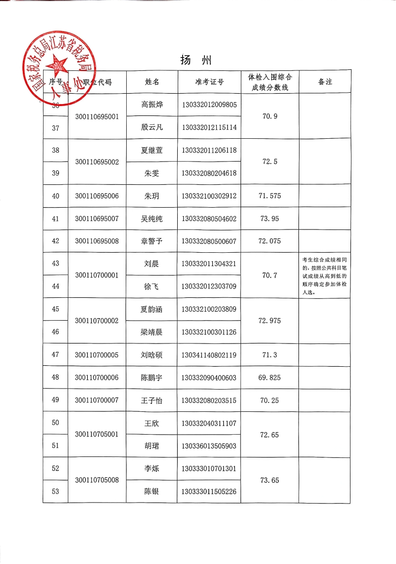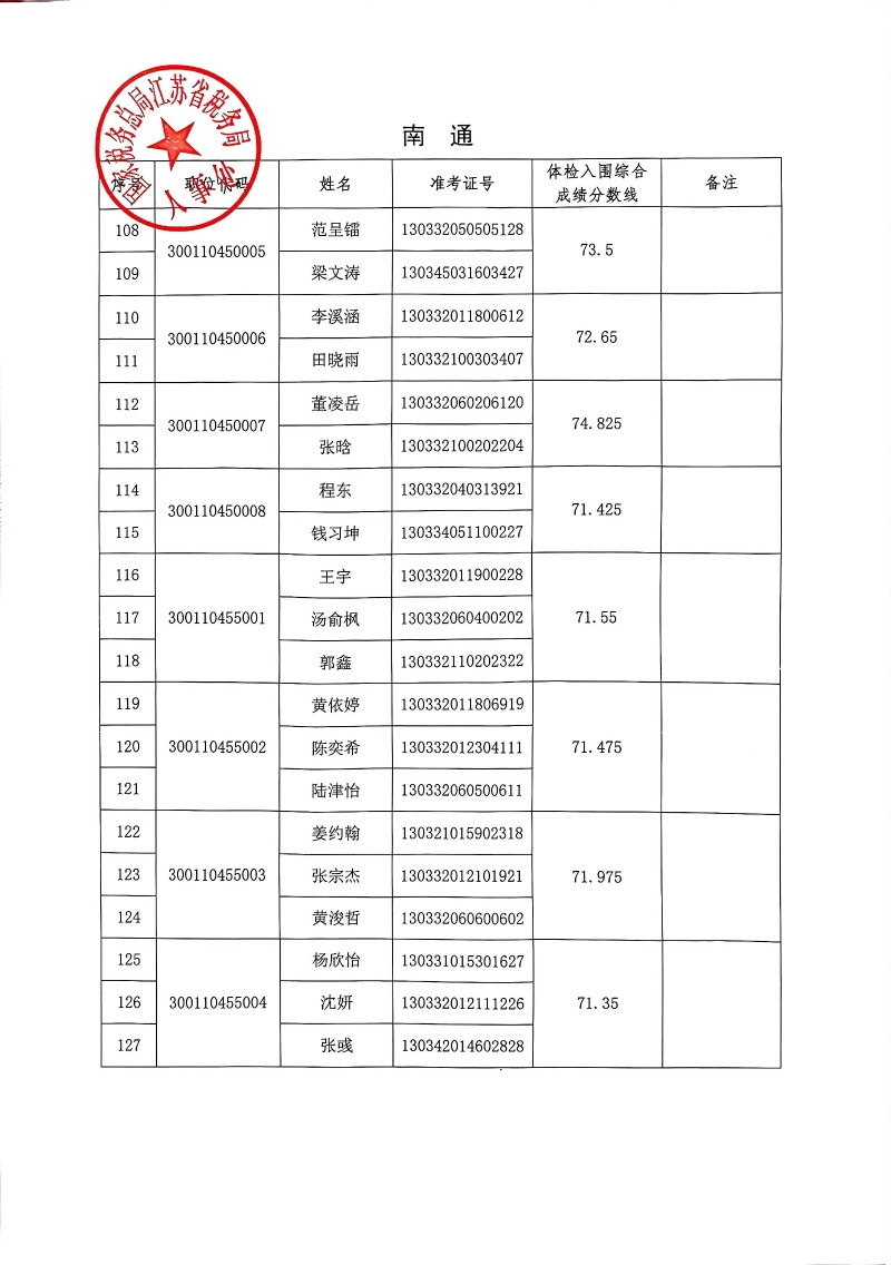 国家税务总局江苏省税务局2026年度考试录用公务员3月18日体检入围人员名单
