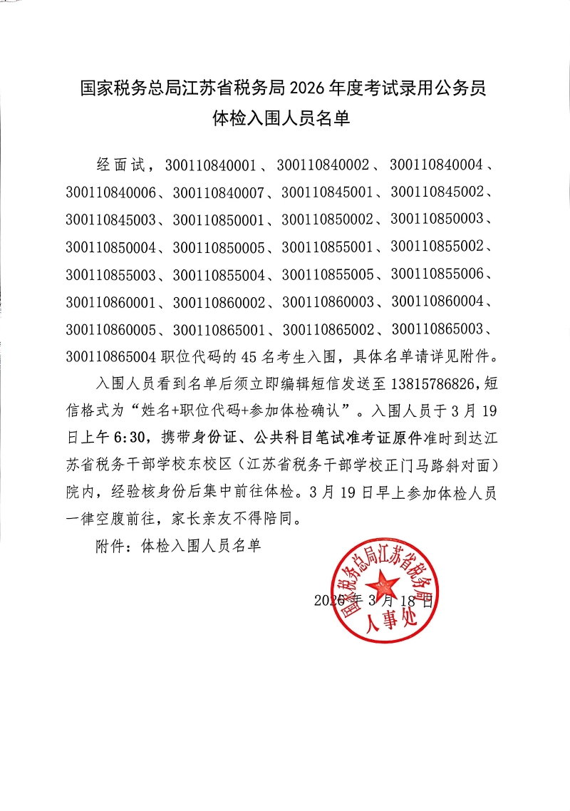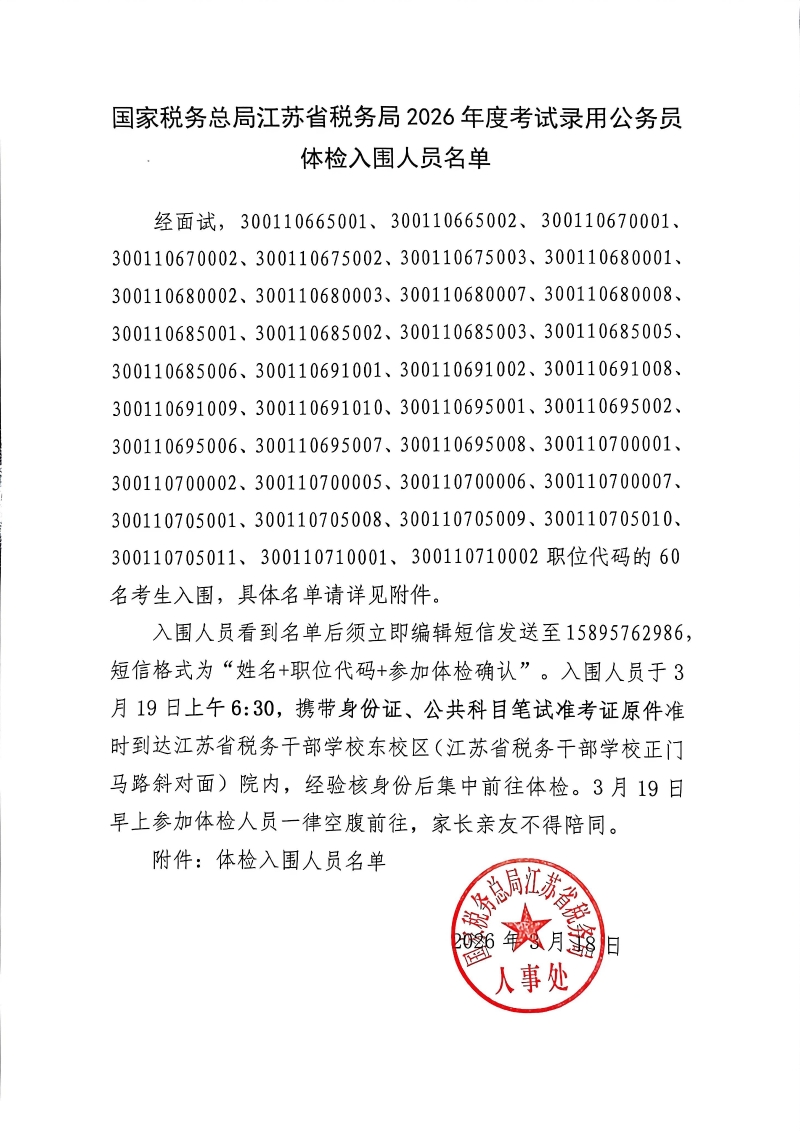 国家税务总局江苏省税务局2026年度考试录用公务员3月18日体检入围人员名单公布如下,请体检入围人员认真阅读注意事项。