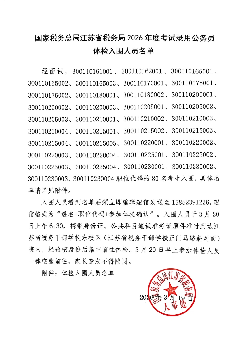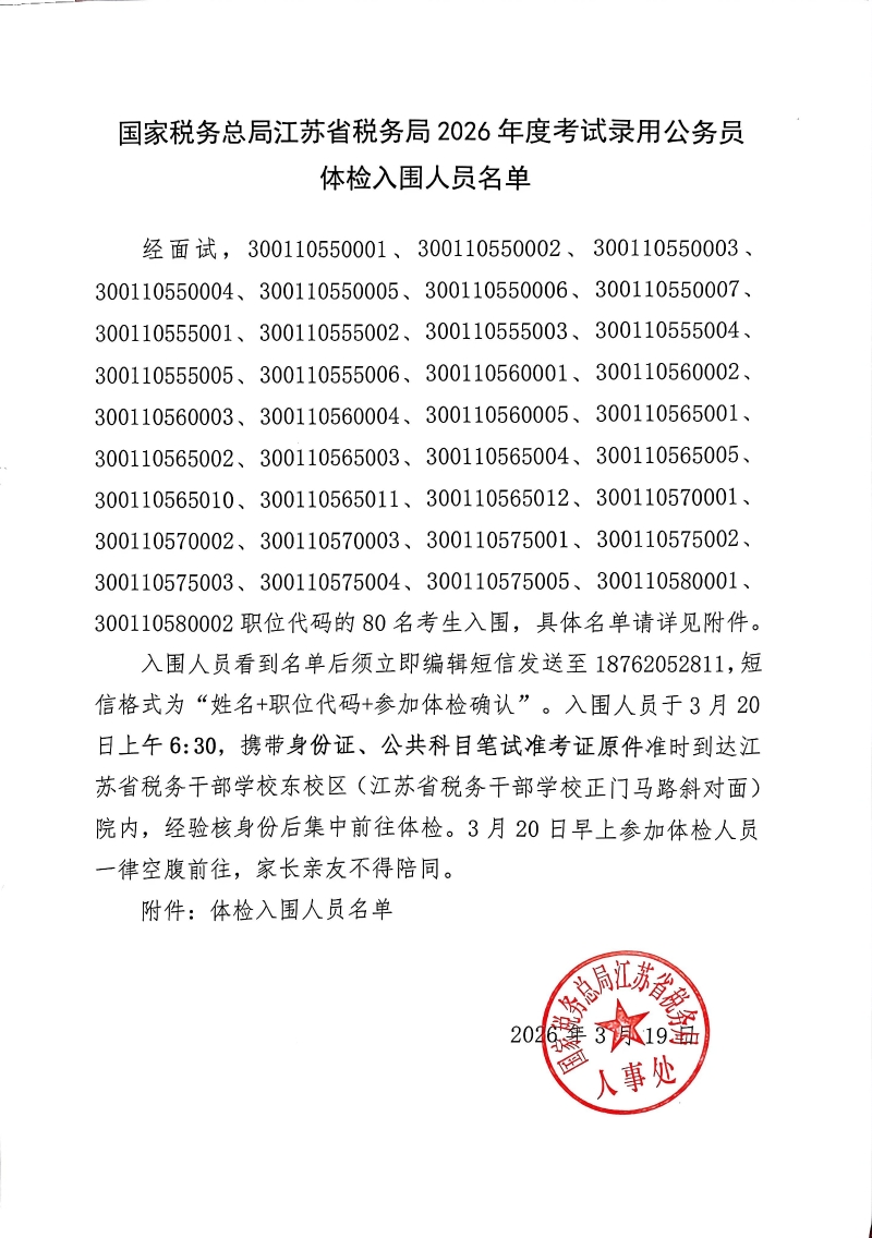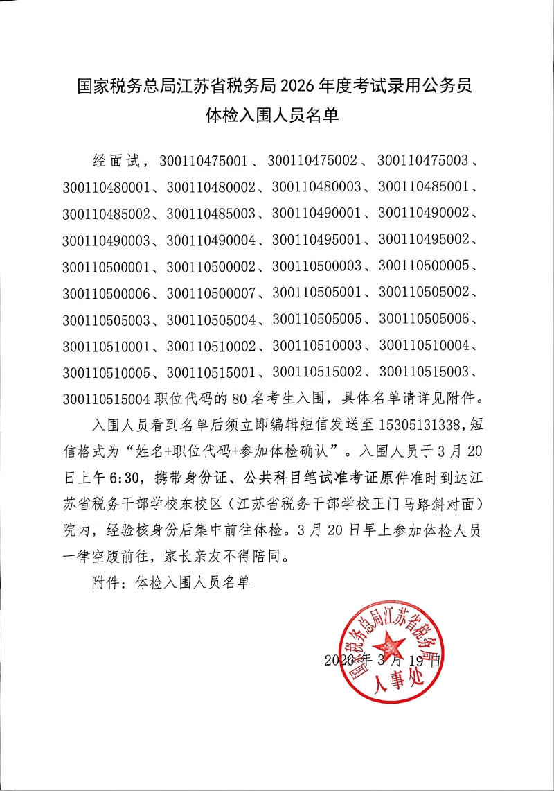 国家税务总局江苏省税务局2026年度考试录用公务员3月19日体检入围人员名单公布如下,请体检入围人员认真阅读注意事项。