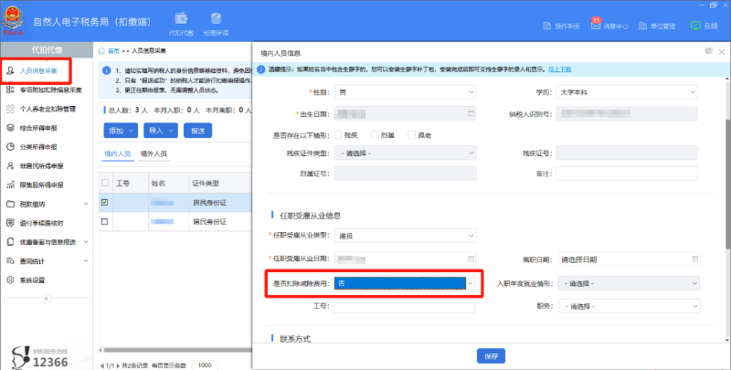 点击左侧菜单栏的【人员信息采集】,找到需要设置的已采集人员信息记录,点击打开,在“是否扣除减除费用”选项中选择“否”,点击【保存】,并重新报送人员信息。