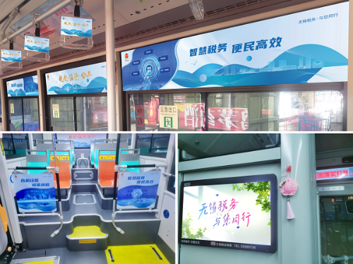 以无锡市税务局办税服务厅和驻市政务服务中心办税服务厅为辐射点,市税务局还精心策划了“税收宣传公交专线”。3路、135路公交车厢披上蓝色“税收新装”,“税收·法治·公平”的主视觉设计大气醒目,“合规经营 诚信纳税”“智慧办税 便民高效”等系列分主题海报点缀在拉手环、座椅、挡板等位置。车载电视循环播放的税收宣传短视频,上演着市井生活里的税收故事:企业会计通过征纳互动服务在线咨询涉税难题、早餐店老板边招呼客人边学习数电发票开具……一个个生活化的场景,让乘客在轻松愉悦的乘车过程中,自然而然地了解智慧税务的便捷高效。