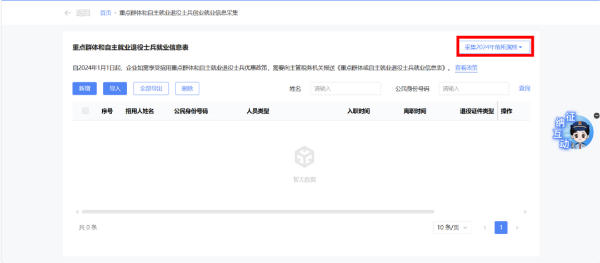 点击【新增】,填写“招用人姓名”“公民身份号码”“入职时间”“离职时间”“人员类型”若人员类型为“自主就业退役士兵”,还需选择“退役证件类型”,填写“退役时间”。
