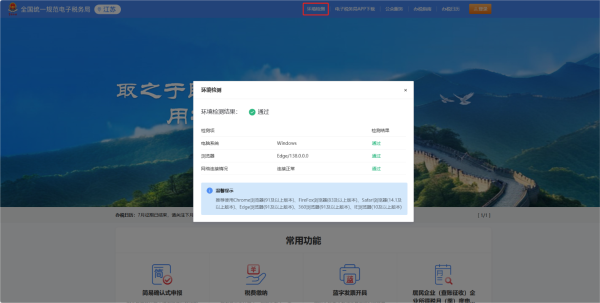 建议您使用电子税务局页面“环境检测”功能检测环境是否符合要求。推荐使用chrome浏览器(91及以上版本)、firefox浏览器(83及以上版本)、safari浏览器(14.1及以上版本)、edge浏览器(91及以上版本)、360浏览器(91及以上版本)、ie浏览器(10及以上版本)。
