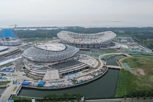 图为施工中的无锡奥体中心。无锡奥体中心位于无锡经济开发区,是环太湖区域稀有的临湖综合体育场馆群,规划有6万座的体育场、1.8万座的体育馆、2000座的游泳馆和全民健身中心,并按照甲级体育场标准进行建设,建成后可承办全国性的大型综合体育赛事。陈晓星/摄